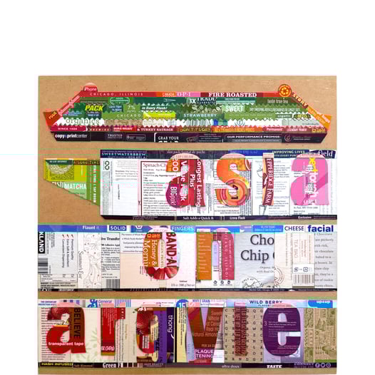 collage, 48"H x 38-1/4"W, cardstock reused from packaging on birch panel