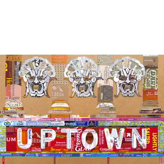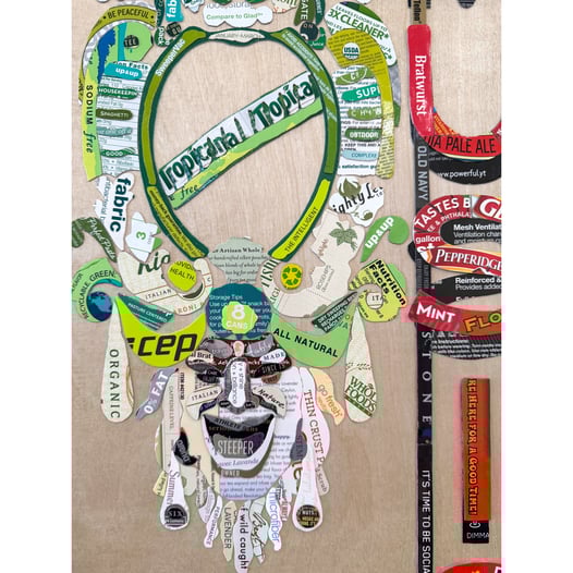 found object collage, low relief, 10"H x 8"W, cardstock paper from consumer packaged goods