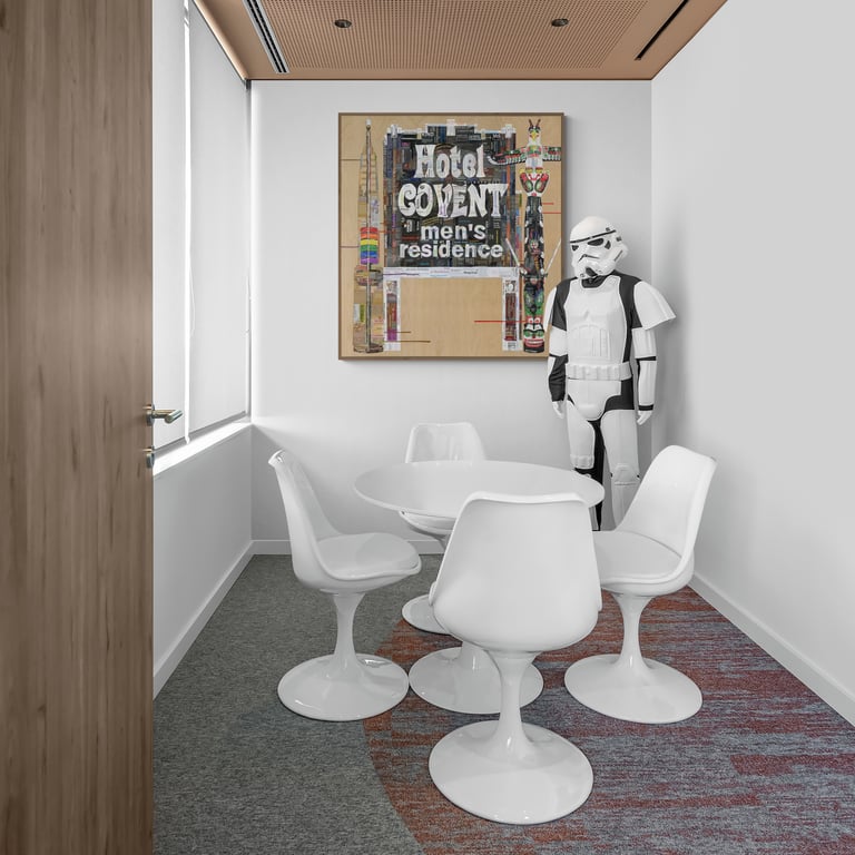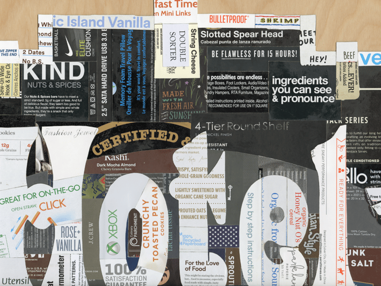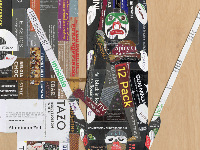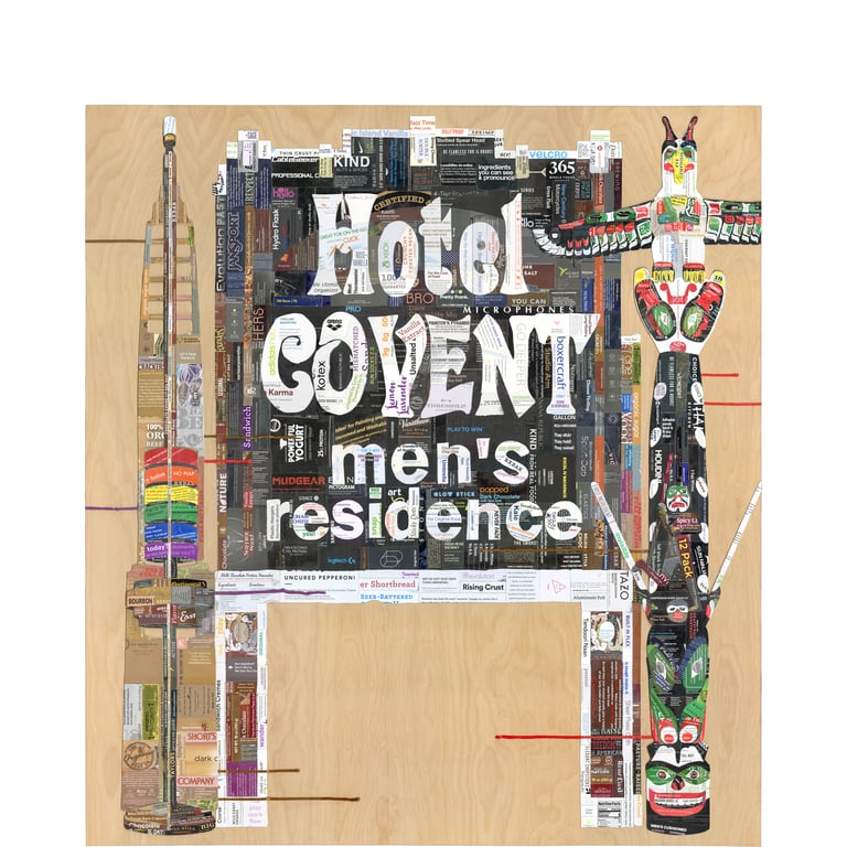 The Gentlemen collage depicts three of Chicago’s landmarks: the totem pole in Lincoln Park, the building façade that housed Hotel Covent in the early 20th century, and one of the twenty rainbow pylons of the Boystown neighborhood. The forms in the composition were taken out of their actual contexts and were scaled and rearranged.